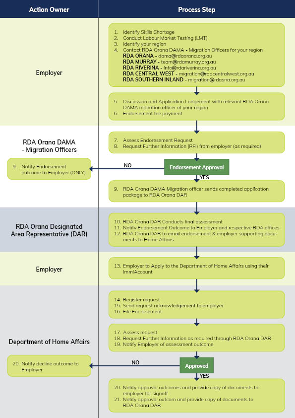 Businesses seeking to access new overseas workers will need to apply to the RDA Orana DAMA Designated Area Representative each subsequent year for endorsement for further occupations, worker nominations or other variations to their labour agreement.